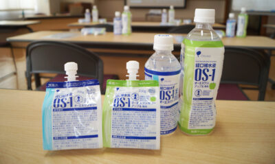 研修では、脱水症の際に用いられる経口補水液を紹介いただきました。大塚製薬工場の「OS-1(オーエスワン)」は脱水症のための食事療法(経口補水療法)に用いる経口補水液です。咀嚼・嚥下困難な方にも使用可能なゼリータイプもあるそうです。
