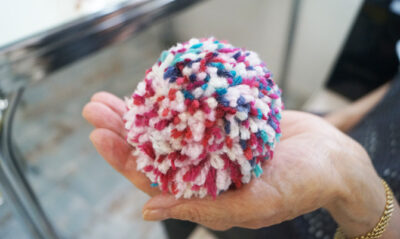 この日は、交流カフェが同時開催され、いろんな種類のお茶をおともに会話を楽しんだり、毛糸のぽんぽんマムを作ったりしました。完成した毛糸のぽんぽんマムは、昨年に続き「弘前城菊と紅葉まつり」の「ぽんぽんマムの庭」会場を演出します。(昨年のぽんぽんマム作りの様子や飾られた会場の様子はこちらをご覧ください)