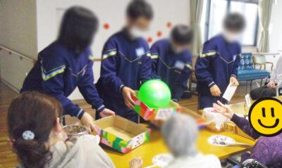 次は、介護老人保健施設の入居者と交流。生徒が考えたレクリエーションで楽しい時間を過ごしました。