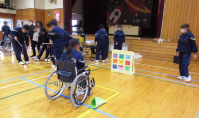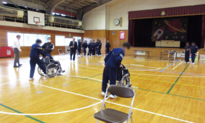 講義の後は、車いすと福祉レクリエーションを体験。生徒が2人一組になり、いすから車いすへの移乗や段差を越える操作を体験しました。