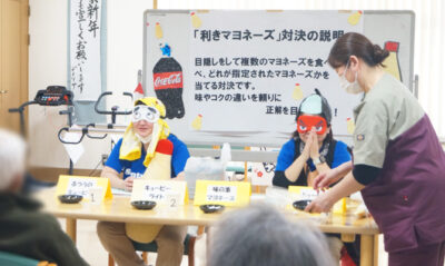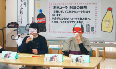 続いては、「利きマヨネーズ」と「利きコーラ」に挑戦。それぞれの味について熱く語っていた職員たちですが、結果はまさかの不正解続出! 利用者様は大笑いしていました。