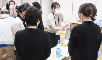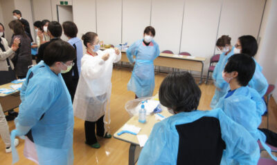 研修では、まず座学で基本的な感染対策について学んだ後、実技演習を行いました。