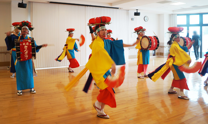 今年は、岩手県盛岡市より「さんさ好み」のみなさまをお招きし、「盛岡さんさ踊り」を披露いただきました。「盛岡さんさ踊り」は、盛岡市とその周辺地域で藩政時代から踊り継がれてきた民俗芸能です。「サッコラチョイワヤッセ」の掛け声と太鼓の音を響かせ、華やかな演舞を披露してくださいました。